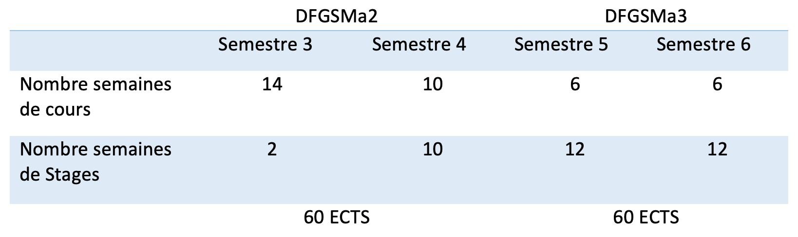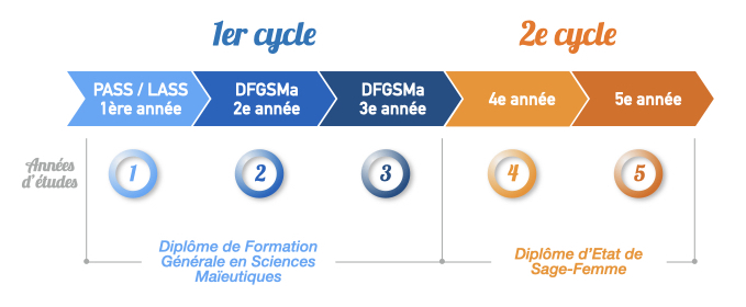 Le diplôme de formation générale en sciences maïeutiques (DFGSMa), 3 premières années (PASS ou LAS, L2 et L3), sanctionne la première partie des études en vue de l’obtention du diplôme d’État de Sage-femme, il comprend 6 semestres de formation validés par l’obtention de 180 crédits européens, conférant le grade de licence.