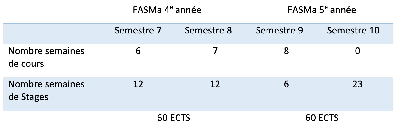 La 5e année comprend un stage long de 23 semaines au second semestre, dont deux semaines de congés mobiles. Ce dernier est dit professionnalisant. En plus d’amener l’étudiant à se positionner comme le professionnel de santé qu’il est en train de devenir, Il lui permet de finaliser son parcours de formation en fonction de son plan de carrière.